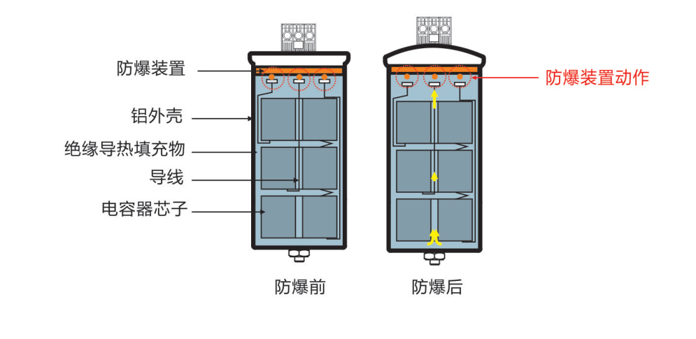 ● 防爆装置;当电容器内部发生故障,温度持续升高导致聚丙烯膜自愈能力下降或者损坏,产生气体压力,过压保护装置会在压力作用下变形升高,进行防爆泄压。